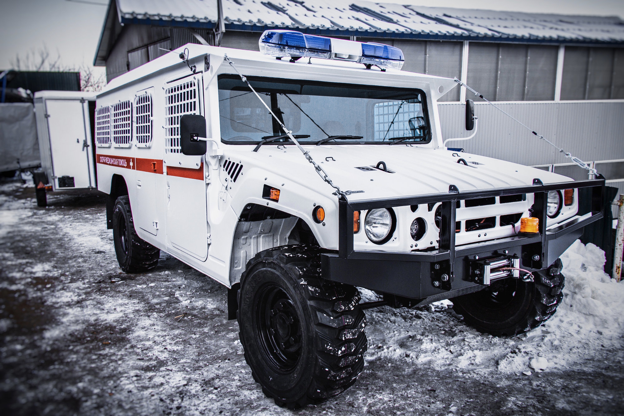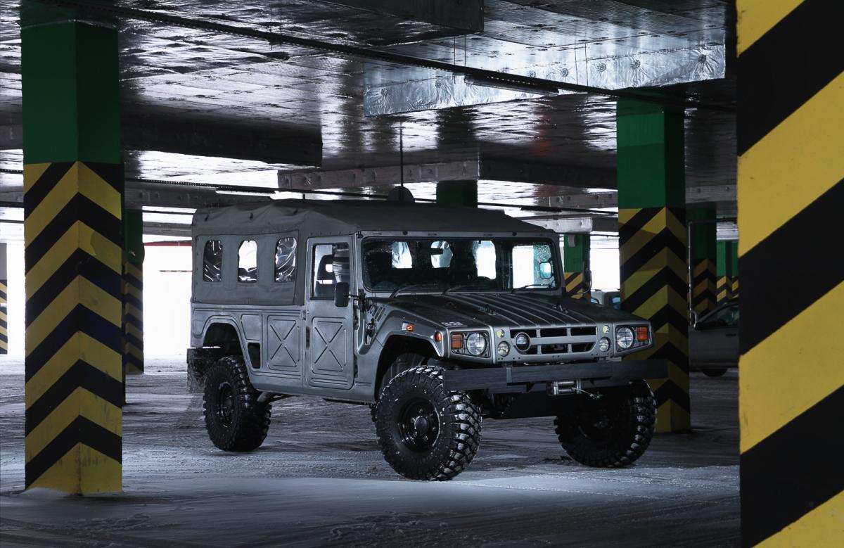 Дизайн кузова сформирован из прямых линий, на переднем бампере присутствуют штатные крепления, позволяющие без лишних проблем установить навесное оборудование. Так же штатно на крышу автомобиля устанавливается металлический багажник, «люстра», а чтобы к этим элементам было удобнее добираться, на корме смонтирована лестница. На распашную дверь багажника подвешено запасное колесо, бампера изготовлены из металла, стекла в окнах подвергнуты заводской тонировке. При оформлении салона основной упор делался на практичность, поэтому комфортабельность обычного легкового авто вы в кабине не обнаружите. Как и в Хаммере передние места внедорожника разделены высокой консолью, поэтому пересесть с одного кресла на другое невозможно, для этого придется выходить из машины и заходить в нее через другую дверь.