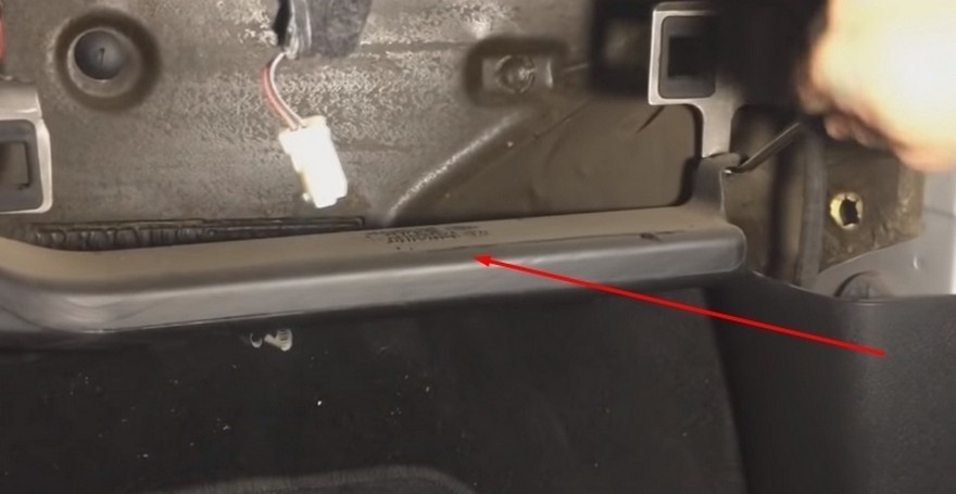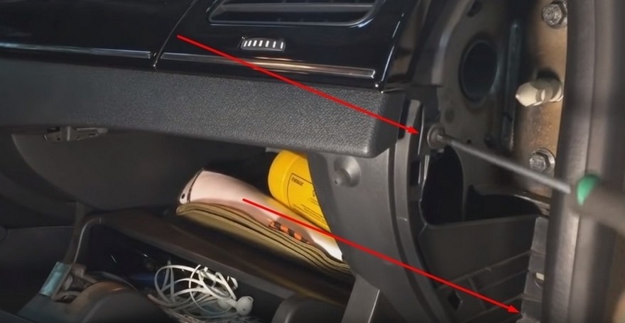 - Под приборкой вам нужно отогнуть конец коврика, после чего выкрутить два винта, которые крепят усилитель поперечины панели к кузову авто.