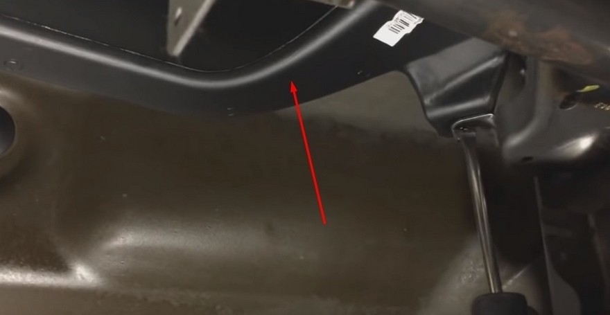 - Через образовавшееся отверстие вы сможете увидеть две гайки, которые крепят наружный усилитель поперечины, их также надо выкрутить. После этого усилитель демонтируется.