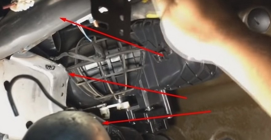Откручиваем три винта крепления пластикового кожуха вентилятора печки.