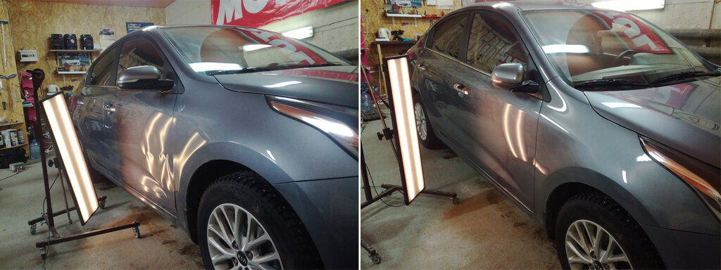 В некоторых случаях мы используем люминесцентные лампы для создания теней в вмятинах, что помогает нашим техникам ориентироваться в поврежденных участках и манипулировать вмятиной, чтобы она была ровной.После осторожного использования инструментов по краям вмятины для удаления размер вмятины уменьшится и в конечном итоге исчезнет.