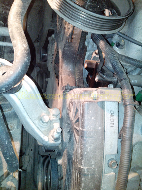 Разборка. Чтобы снять крышку ГРМ, снимаем правое переднее колесо, защиту двигателя, локер. Снизу получается доступ к ролику 97834-29010 (Mobis) и ремню кондиционера 97713-2D510 (Mobis) . Ослабив регулировочный болт, снимаем ремень привода кондиционера. Получается максимальный доступ к ремню ГРМ и роликам. Далее необходимо поддомкратить двигатель и снять опору.