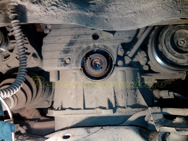 Сняв шкив и заблокировав коленвал, получаем доступ для снятия натяжного ролика ГРМ. Необходимо запомнить, как стоял натяжной ролик ГРМ. В головке блока есть два отлива, в один из которых устанавливается крючок натяжного ролика ГРМ. Необходимо новый ролик установить в тот же отлив. - Демонтируем ремень вспомогательных механизмов и снимаем натяжительный механизм.